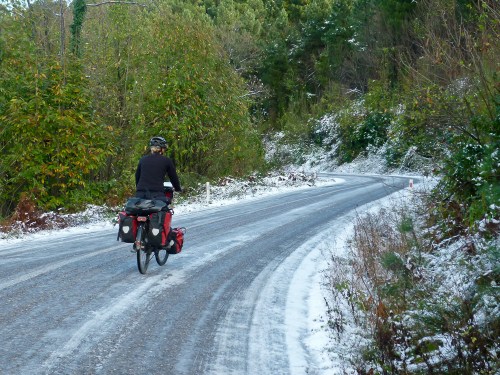 Given the biting rain, wind and hills we have been surprised to have had some of our best days so far. Violent waves, winding climbs and snow peaked mountains is pretty awe inspiring stuff from two wheels, so we do get rewarded for our efforts. It’s a great feeling being curled up in the tent at night and thinking about what we achieved and experienced in the day. The other night I was zipped me up my sleeping bag with just my mouth exposed to keep warm and was being fed cookíes, unfortunately only on a cycle tour is that acceptable behaviour.