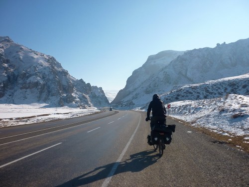 So far we’ve crossed two mountain passes (of 1875 metres and 2409 metres – for reference, Ben Nevis is 1344 metres, and the highest mountain in last year’s Tour de France, the Col du Tourmalet, is 2115 metres) which came complete with summit signs for celebratory photos. These were much more fun than the short but steep climbs on the coast. On the coast the hills were short but incredibly steep, requiring every last ounce of our effort as we stood on the pedals to battle gravity, and as we began and ended each day at sea level our efforts felt wasted. In the mountains however, the climbs generally involve around forty kilometres of relatively gentle ascent (proven by the fact that Bex’s panting remains in earshot behind me), which takes a half a day of more measured effort. The road crawls between huge hills, the entire landscape white with snow with the exception of a strip of black tarmac ahead and behind. When we reach the summit we’re rewarded with a real sense of achievement – we’re standing on top of a mountain pass, with a photo to prove it!