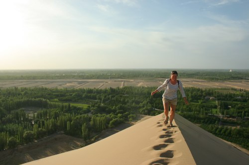 The longer breaks have given us time and energy to do a lot more “proper” sightseeing. Some tourist flashpacker days in between the grind has been great to keep spirits up and I have been absolutely loving our lifestyle of late. We really have had a wonderful few weeks and seen some breathtaking sights. In Dunhuang, an oasis city, we climbed Lawrence of Arabia sand dunes and watched the sunset over a beautiful crescent moon lake. Perched high on the dunes looking down on busy ant-like tourists we were pleased with our intimate spot and felt it was worthwhile skirting the fence and hiking into the dunes for some solitude (and avoiding the extortionate entrance fee).